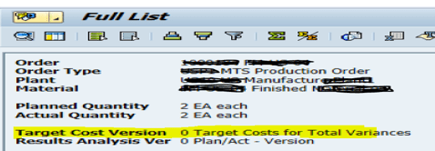 ● Manufacturing Order Plan Cost (PLANORD01) =Target cost version 1.