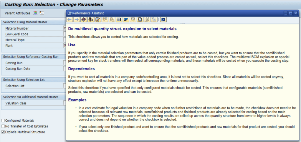 In S/4HANA 1809, In costing runs, quantity structure explosion is now part of the Selection step rather than a separate, optional step in the process flow. Explosion can be triggered with the Multilevel Quantity Structure Explosion option in the Selection step.
